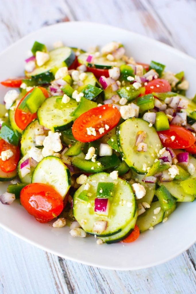 Forget the lettuce—that's so last year. Cucumbers are marinated in red wine vinegar, sugar, salt, chopped tomatoes, red onions, mint, and olive oil; 1 1/2 cups cherry tomatoes, halved. Are you obsessed with feta cheese like i am? Toss the tomatoes, cucumbers, and lemon juice in a bowl with 2 teaspoons of the salt.